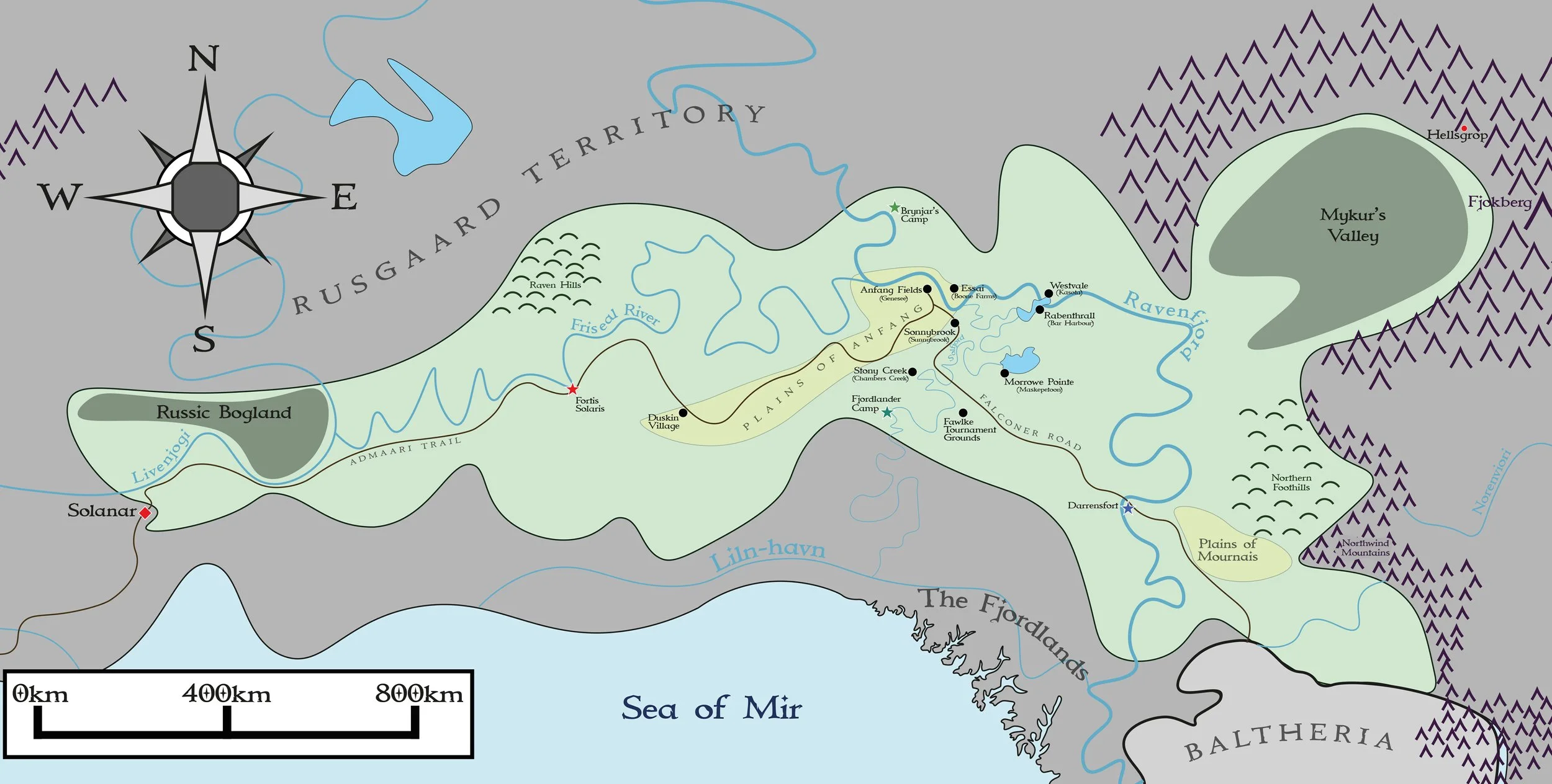 The folk of the mountainous river lands are a distinct bunch. They share a lot with their northern neighbours, the Rusgaard, but reject some of their more savage ways and understand the need for civilized diplomacy and cooperation. The Fjordlands sit just on the northwest border of Cereon, so the two nations often spar over border disputes and the Fjordlanders resist the overarching influence of the Baltherians. Most Fjordlanders fish, craft or trade with access to the Sea of Mir. They find themselves fending off Rus raids and Baltherian colonizing efforts often. Under the banner of the kelpie, a universal sign of unity for the Fjordlanders many houses and settlements, they push into the Ravenwood to stake their claim of true independence.