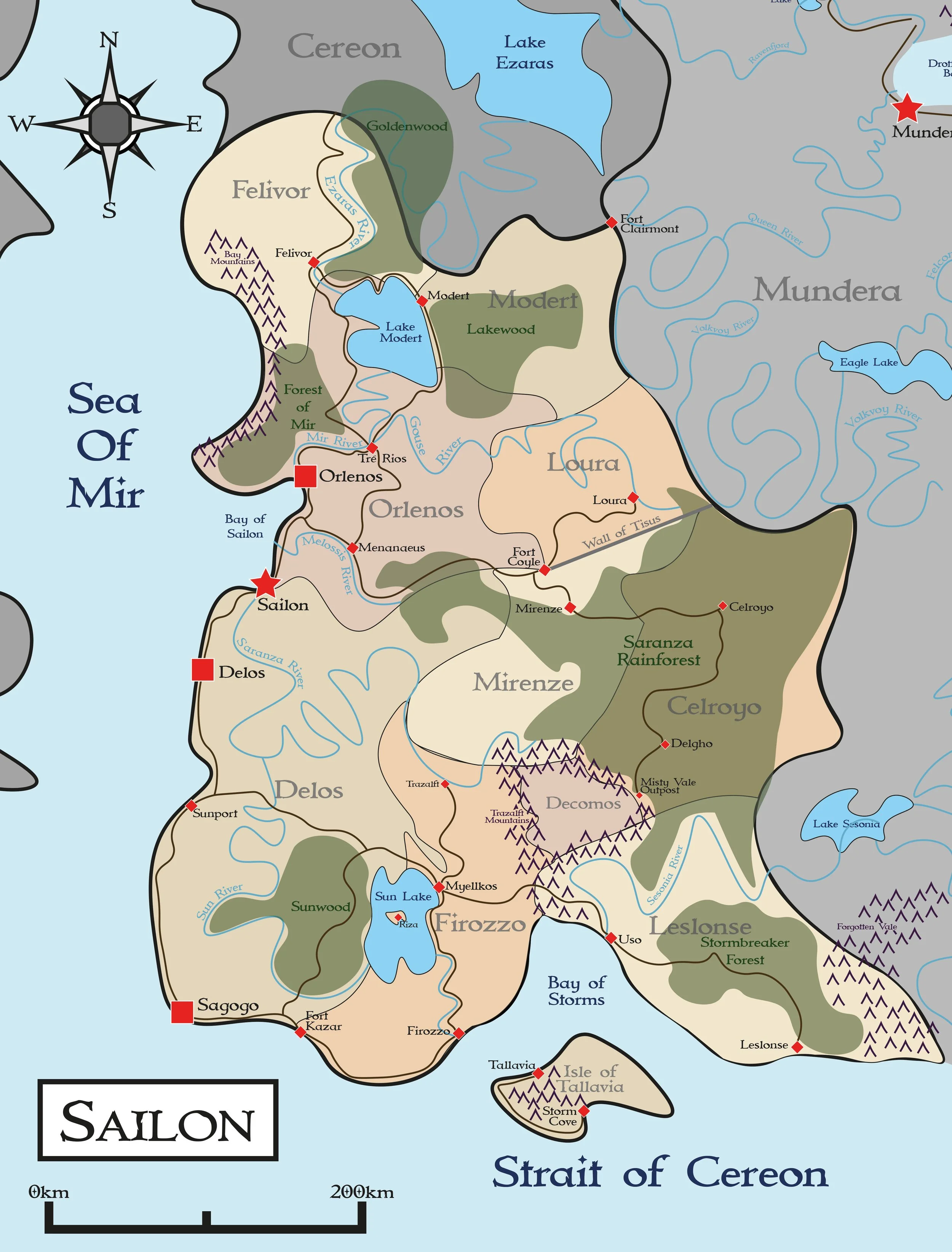 Sailon is also home to one of the greatest heroic figures in Miradawn, Felivor the Great, namesake of the northernmost province. He was a warrior of humble origins who led a movement to unite and free the people of Sailon from the corrupt and influential families of power of elder Sailon. His campaign was in vain as the people could not ultimately unite.