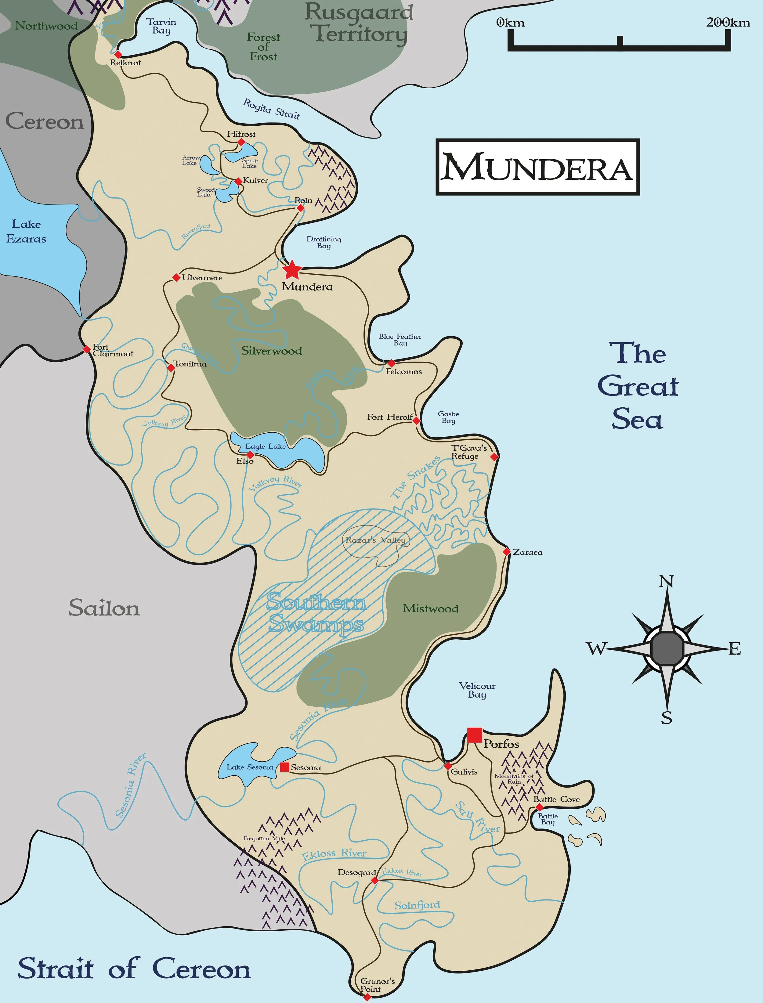 Mundera’s topography in the north is almost as diverse as its people. In the north, you have the frigid waters and snow-touched cliffs of Tarvin Bay, whereas the southern coasts in the vast Velicour Bay boast sandy beaches and rolling sub-tropical grasslands. This variation has given Mundera a great variety of resource access, from forestry, fishing and some mining as well. With the wildest waters in all of Miradawn, Mundera’s sailors are second to none and provide most of the backbone in Baltheria’s naval prowess.